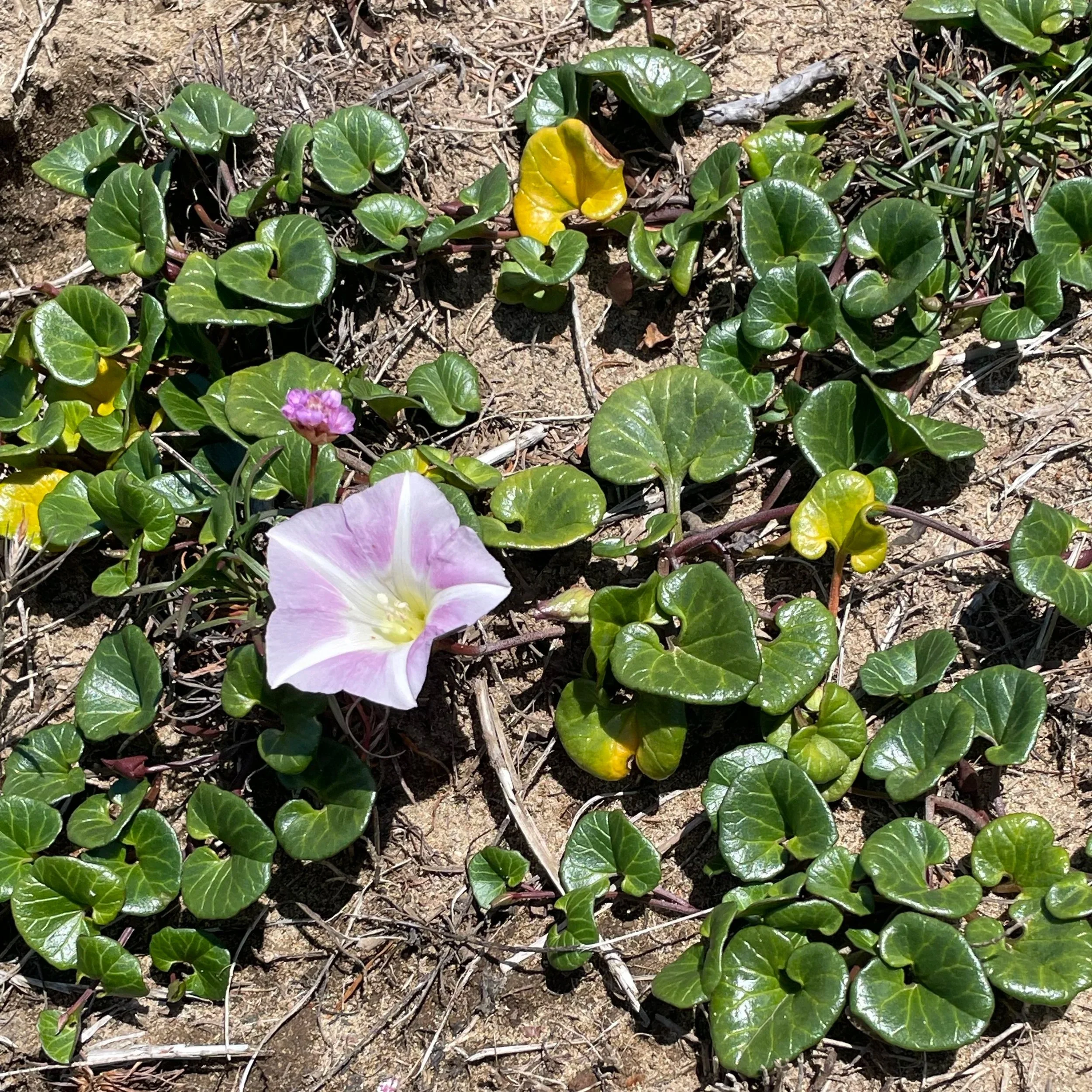 We often get calls from friends and client wondering if this is the dreaded invasive bindweed. And NO! Despite it’s similar appearance, it’s not even the same genus. A lovely trailing native dune plant that grows in straight sand easily from seed. Note the shiny rounded leaf that differs from bindweeds’ matte finish, pointed leaf. It also hugs the ground and won’t climb up other plants like bindweed.